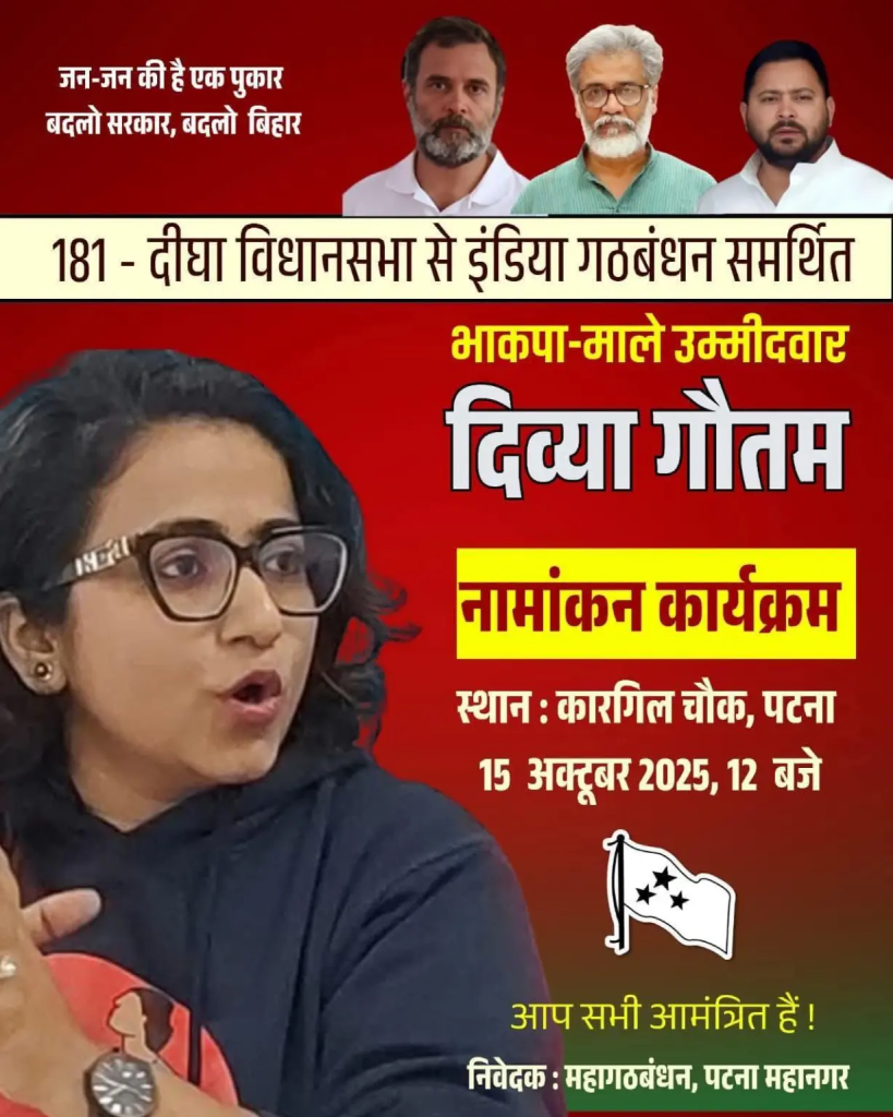 মহাজোটের মধ্যে আসন ভাগাভাগি চুক্তির আগে, এই পোস্টারটি রাজনৈতিক মহলে বিতর্কের জন্ম দিয়েছে যে মহাজোটের মধ্যে আসলেই সবকিছু ঠিকঠাক আছে কিনা। ভাইরাল পোস্টারটিতে আসলে প্রার্থীপদ এবং মনোনয়নের তারিখ উল্লেখ করা হয়েছে। পোস্টারটিতে লেখা আছে, “১৮১-দিঘা বিধানসভা কেন্দ্র থেকে ইন্ডিয়া অ্যালায়েন্স সমর্থিত সিপিআই-এমএল প্রার্থী দিব্যা গৌতমের মনোনয়ন অনুষ্ঠানে আপনারা সকলেই আমন্ত্রিত।”